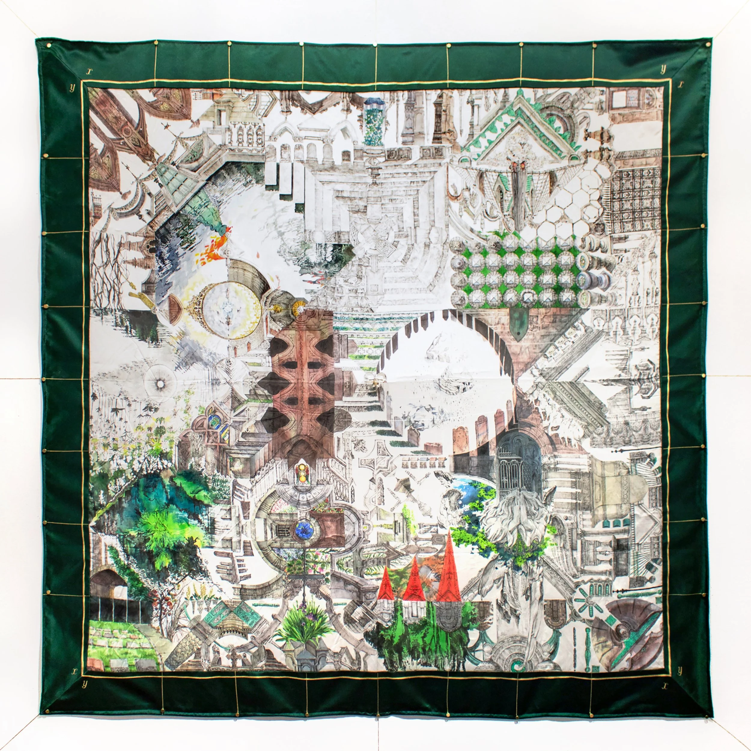 The work consists of two interconnected parts. The Anti-Fractal Map, created with pen and watercolor on silk, represents both the hermit crab’s shell and the terrain of the island. The map incorporates traces from historically, religiously, and culturally layered sites the artist has visited, reflecting the accumulated histories and entangled stories of these places. These traces are layered over the folded paper structure, forming anti-fractal patterns that seem navigable but ultimately confound orientation. Demagnified z-axis + Hermit Crab’s Body symbolizes the crab’s body, particularly its eyes, and provides a unique perspective between the dimensions of the world and individual perception. As visitors move through the intricate terrain of the work, they explore the shifting boundaries between perception and imagination.