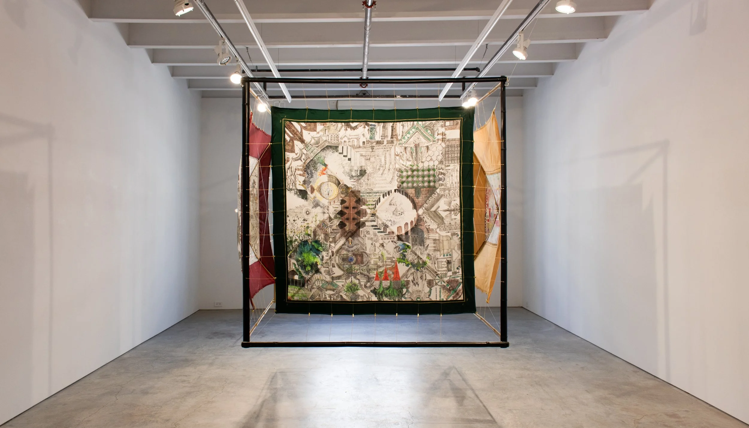 본 작업은 두 가지 파트로 구성된다. 실크 위에 펜 드로잉과 수채로 제작된 The Anti-Fractal Map은 소라게의 껍질이자 거대한 소라게 섬의 지형을 기록한 지도이다. 지도에는 작가가 방문한, 다양한 사람들의 역사와 이야기가 얽힌 종교적·문화적·역사적 장소들의 구조와 흔적이 반영되어 있다. 반복적으로 접고 펼친 종이에서 생성된 선 구조 위에 중첩된 이러한 흔적들은 출구가 있는 듯 보이지만 끝내 방향을 잃게 만드는 안티-프랙탈 구조를 형성한다. 한편 Demagnified z-axis + Hermit Crab’s Body는 소라게의 몸체, 특히 눈을 상징하며, 세계와 개인의 인식 공간이라는 두 차원 사이의 독특한 시각을 제공한다. 관람자는 작품 속 복잡한 지형을 따라 이동하며, 끊임없이 변형되는 구조 속에서 인식과 상상의 경계를 탐험하게 된다.