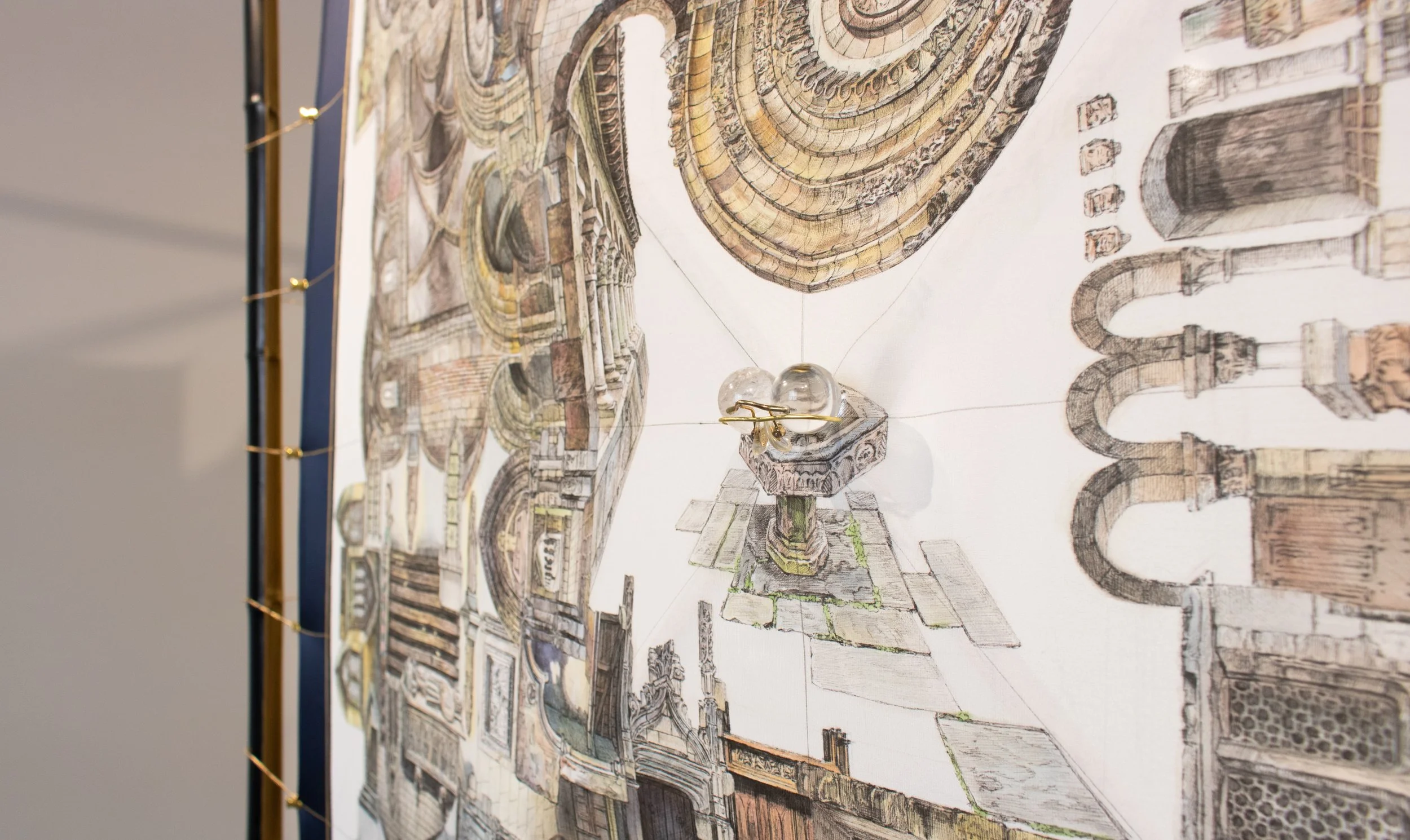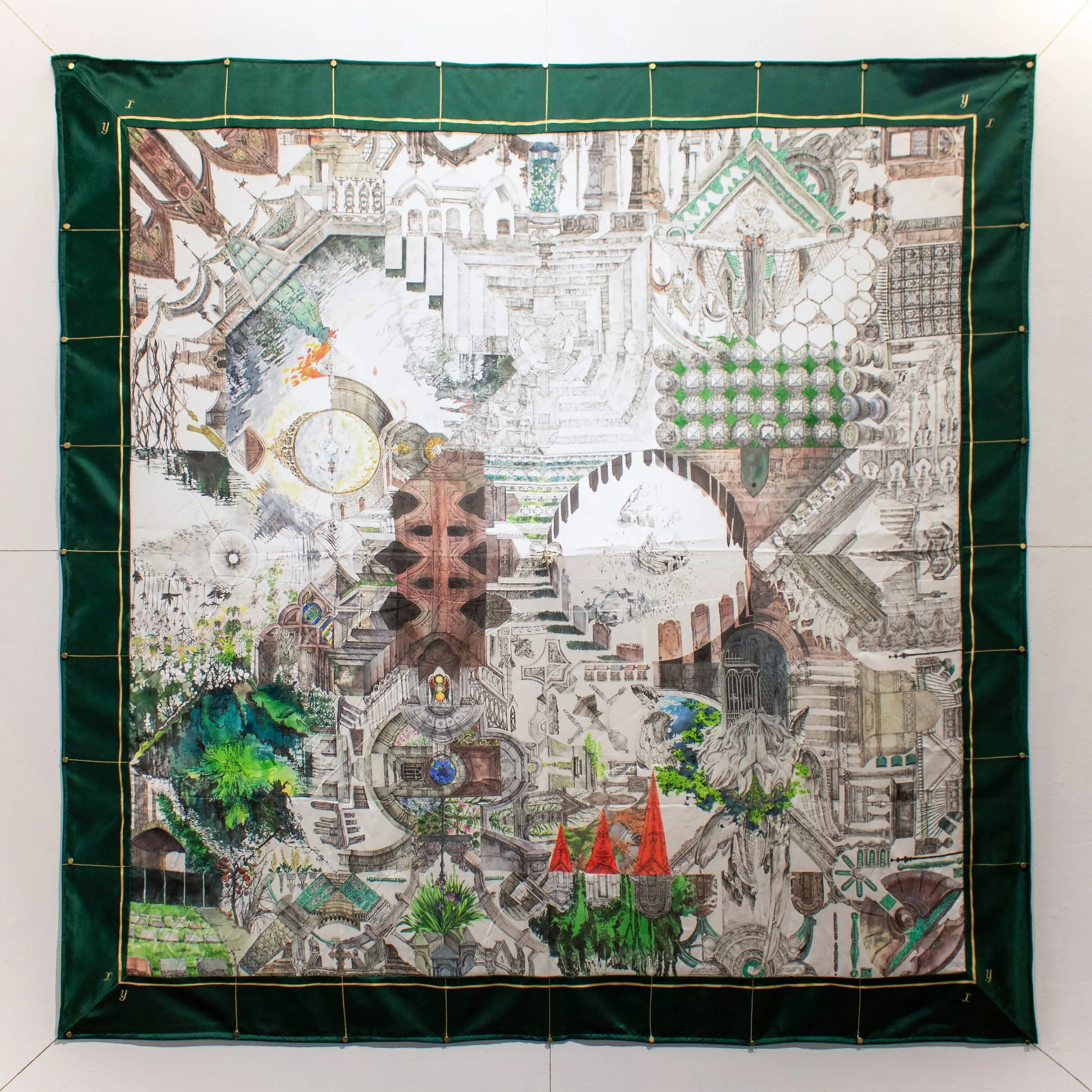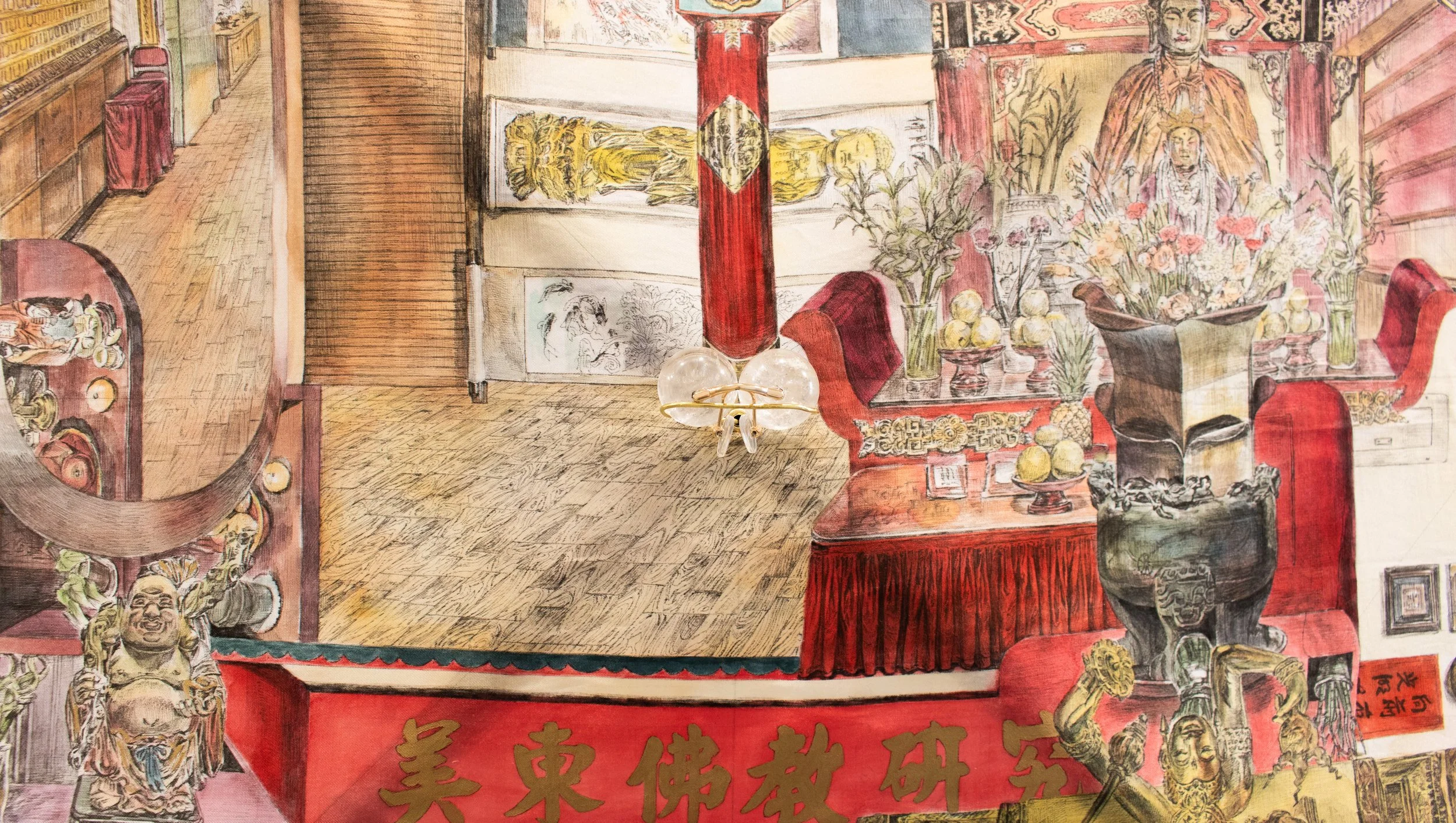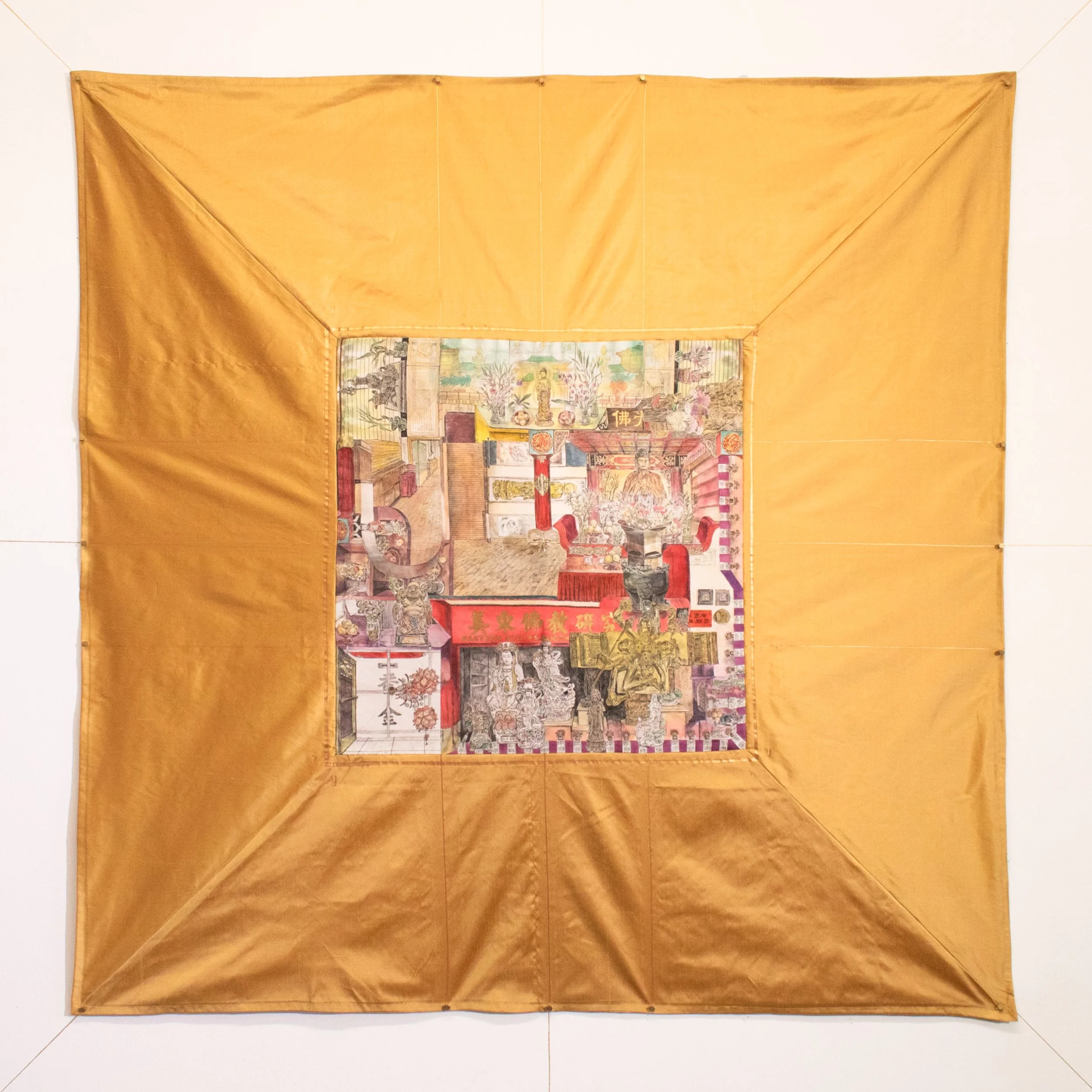 Pen drawing, Japanese watercolor, Chinese ink, gold leather paint on silk and mixed media