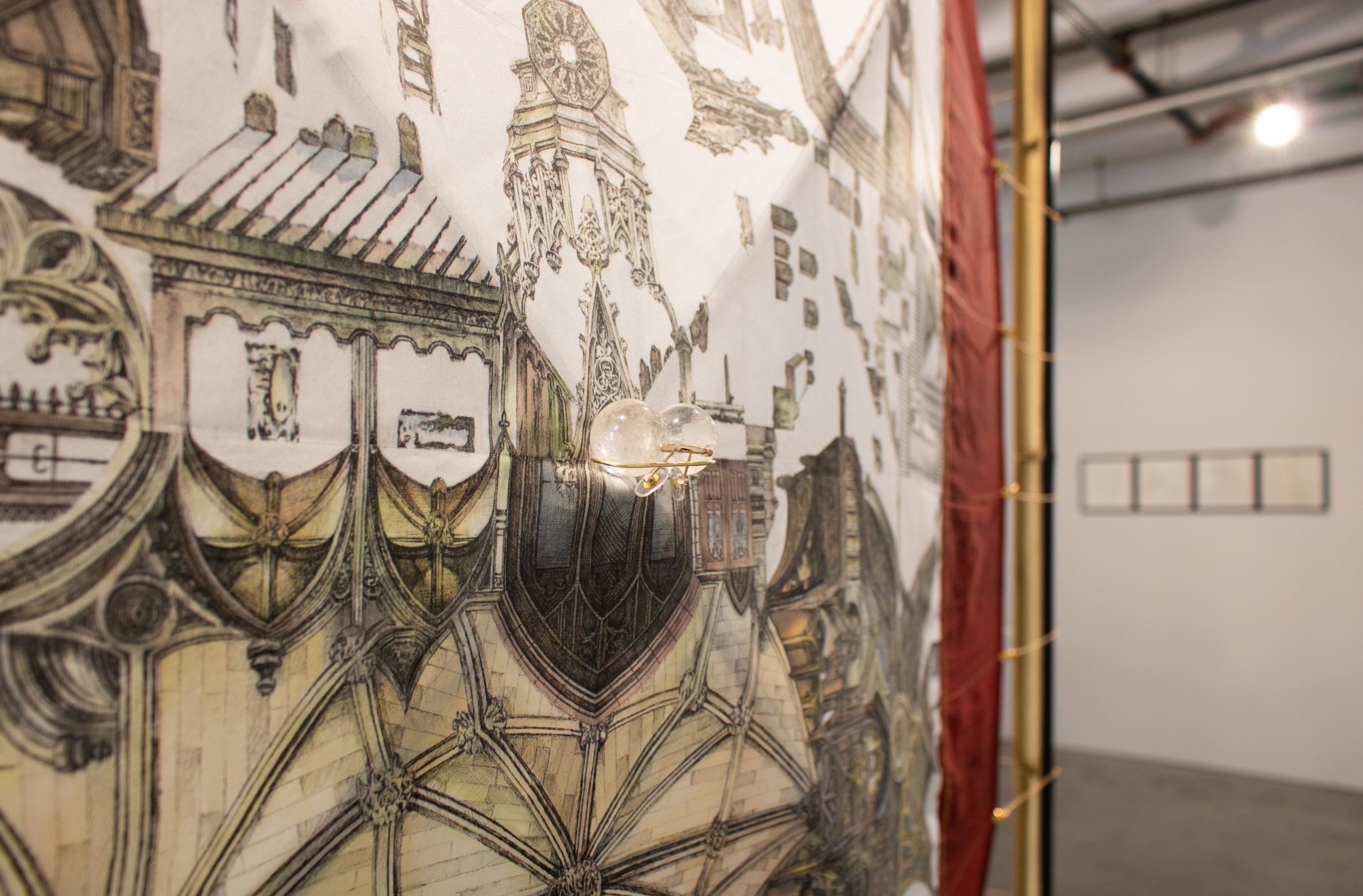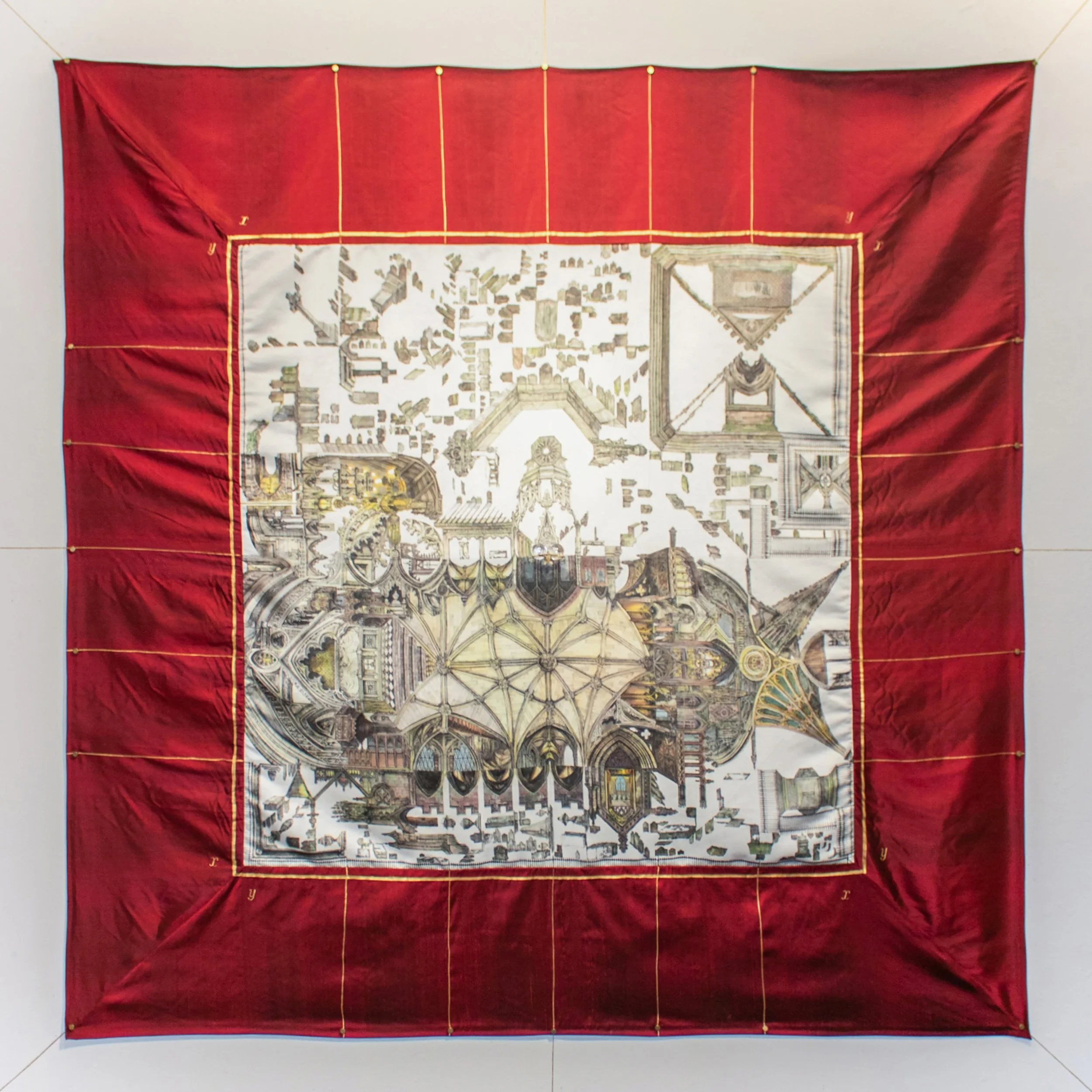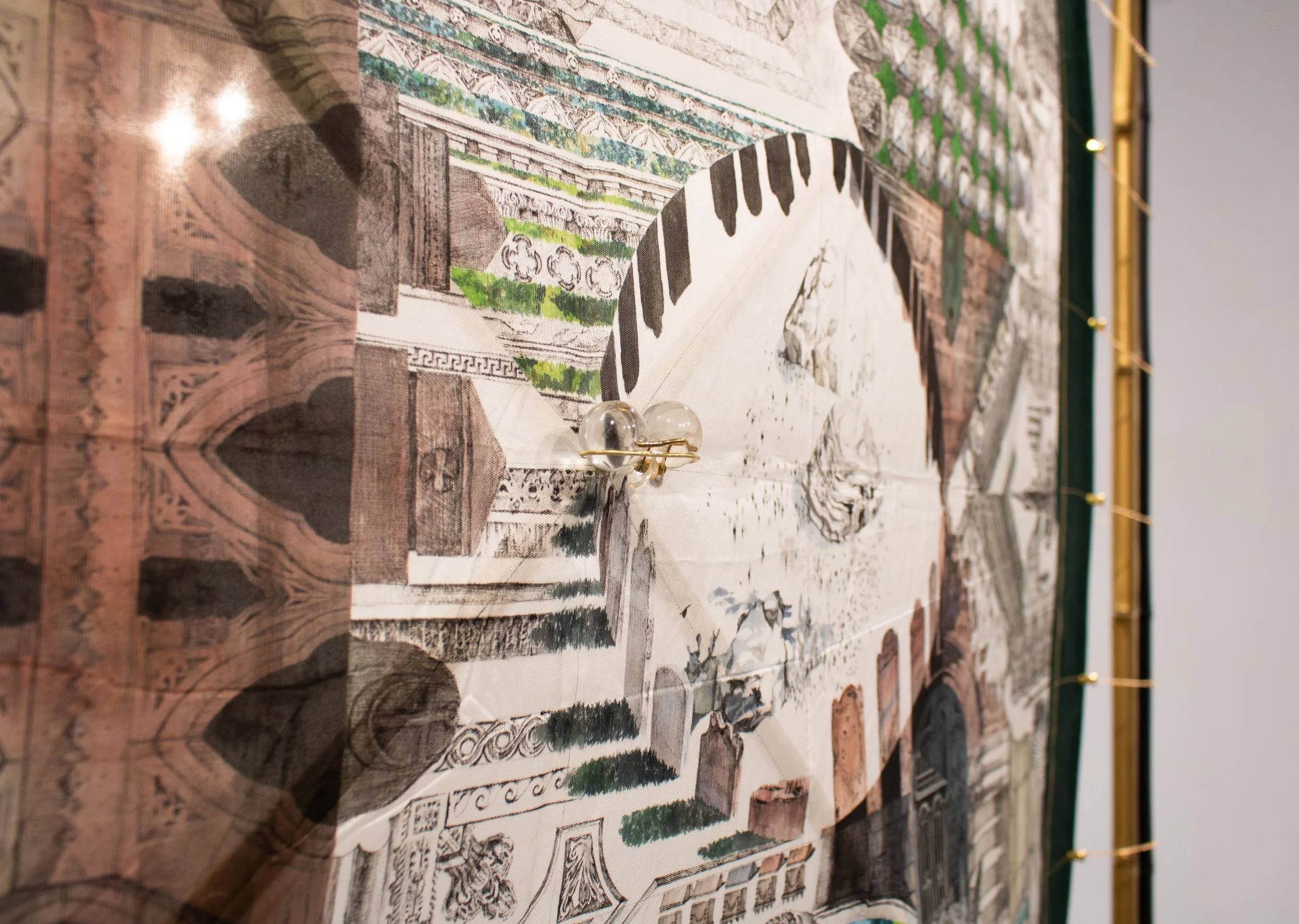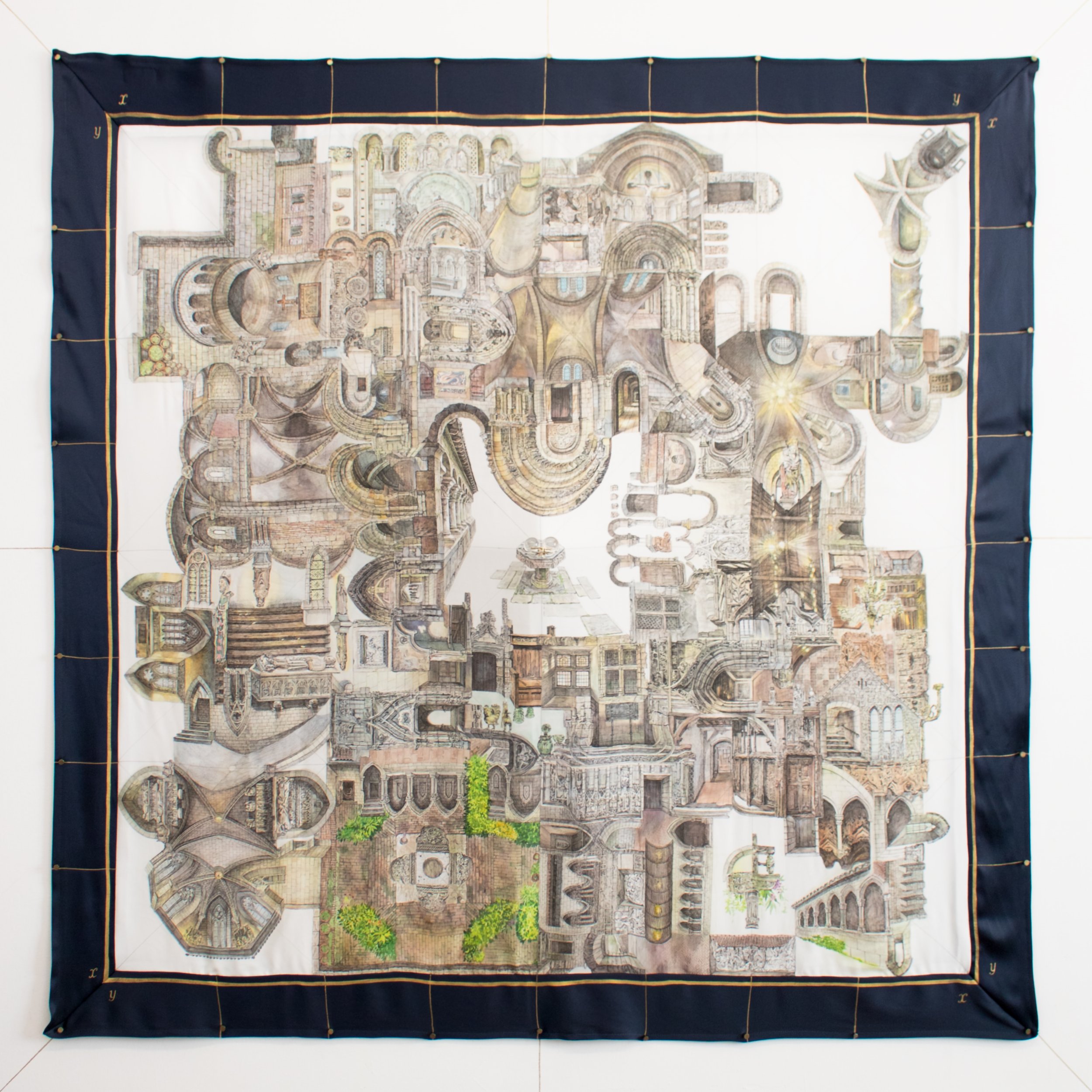 Pen drawing, Japanese watercolor, Chinese ink, gold leather paint on silk and mixed media